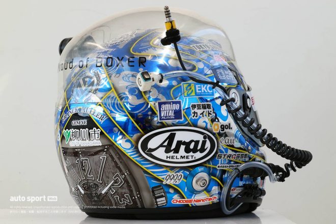 ペインターは九州のサイドワインダーズさん。今年のヘルメットをペイントするにあたっては「和風にしてください」とお願いしました。「葛飾北斎みたいな」って。なかなかカッコ良くないですか? 配色を変えたおかげで、今年はいままでで一番、イメージが変わったかもしれません。