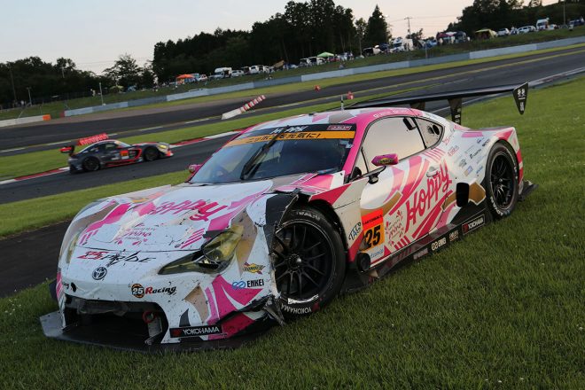• au TOM’S LC500と接触し、ボディ右側にダメージを負ったD’station Vantage GT3