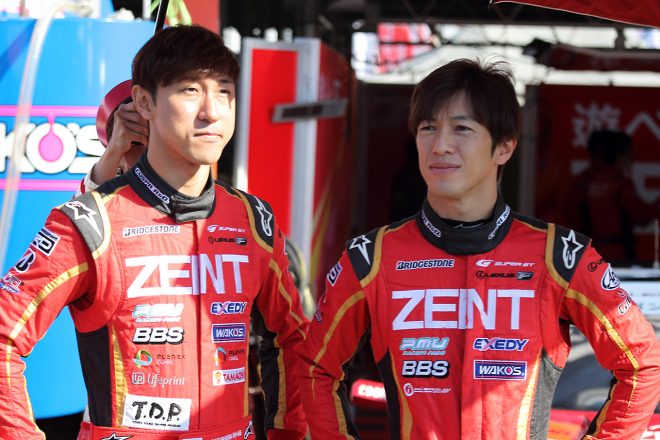 • 2位表彰台を獲得したZENT CERUMO LC500 の立川祐路(右)と石浦宏明(左)