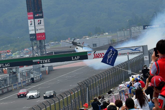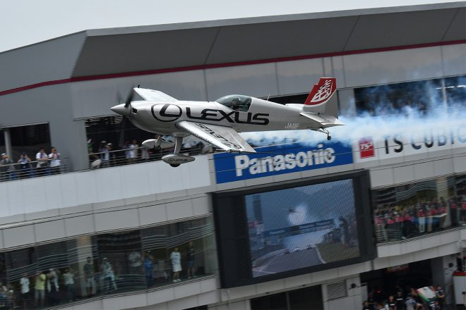• 2018年、富士スピードウェイのメインストレートを通過する室屋義秀のエクストラ330SCと3台のレクサス